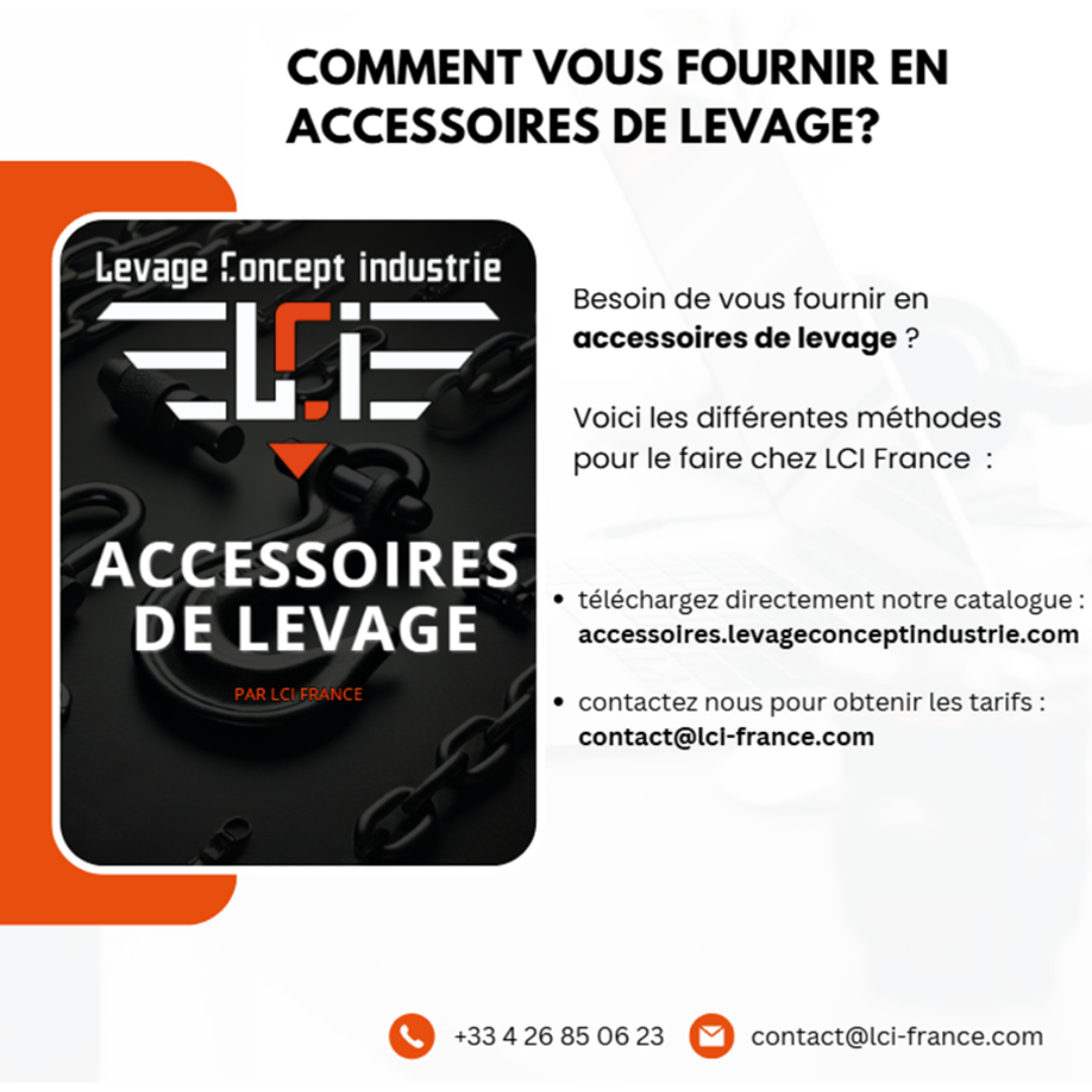 Si vous avez besoin d'accessoires de levage, LCI met à votre disposition sa large gamme de produits (élingues, crochets, sangles…) afin de combler vos besoins en accessoires.