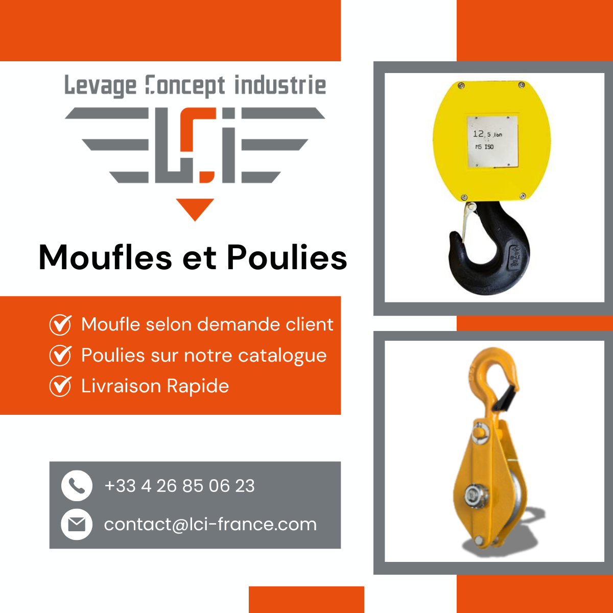 LCI peut vous fournir en moufles en fonction de votre demande personnalisée, nous savons que certains de nos clients ont des demandes particulières pour la fourniture de moufles nos équipes seront ravis de vous conseiller sur une moufle parfaitement adaptée à vos besoins qui assurera un levage efficace et sécurisé de vos charges.
